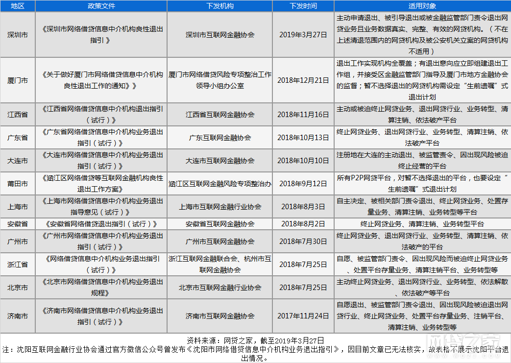 据网贷之家不完全统计,截止目前,已有包括深圳市、厦门市、江西省、广东省、大连市等12个省市发布了良心网贷机构良性退出的指引,具体如下表: