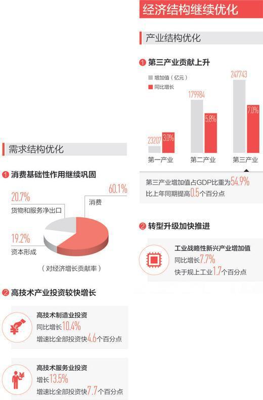 需求结构在优化。消费的基础性作用继续巩固,上半年最终消费支出对经济增长的贡献率达到60.1%,在全部居民最终消费支出中,服务消费占比为49.4%,比上年同期提高0.6个百分点。投资的结构也呈现优化的趋势,比如社会领域的投资、高技术产业的投资、制造业技术改造的投资都保持在10%以上的较好的水平。