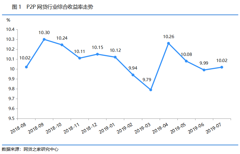 2019年7月,网贷行业综合收益率为10.02%,环比上升3个基点,结束此前连续2个月的下跌趋势,再度回到了10%关口以上。