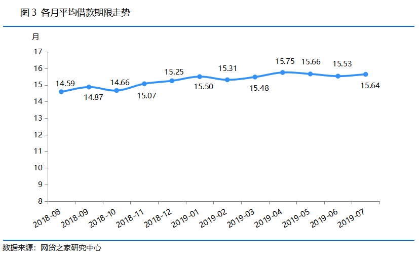 月报显示,7月网贷行业平均借款期限为15.64个月,环比拉长0.11个月,结束了此前连续2个月的缩短势头,同比拉长了2.65个月。