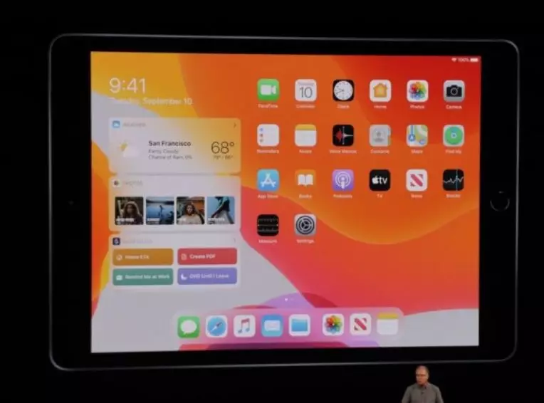 首先登场的是新款iPad,共有9.7英寸和10.2英寸两个版本。新款iPad搭载A10Fusion芯片,据苹果高管介绍,该芯片使新iPad比最畅销的PC快2倍。具备智能连接头,可以连接智能键盘、支架,以充分利用iPad OS功能。