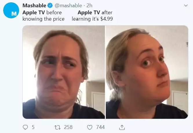 知道Apple TV Plus价格前(嫌弃)/知道Apple TV Plus价格前后(真香)(图片来源:Twitter截图)