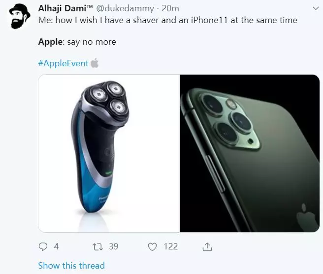 我:我真想同时拥有剃须刀和iPhone 11苹果:我懂了(图片来源:Twitter截图)