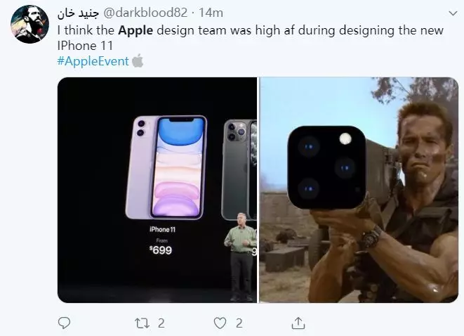 我觉得苹果设计团队在设计iPhone 11的时候肯定喝大了(图片来源:Twitter截图)