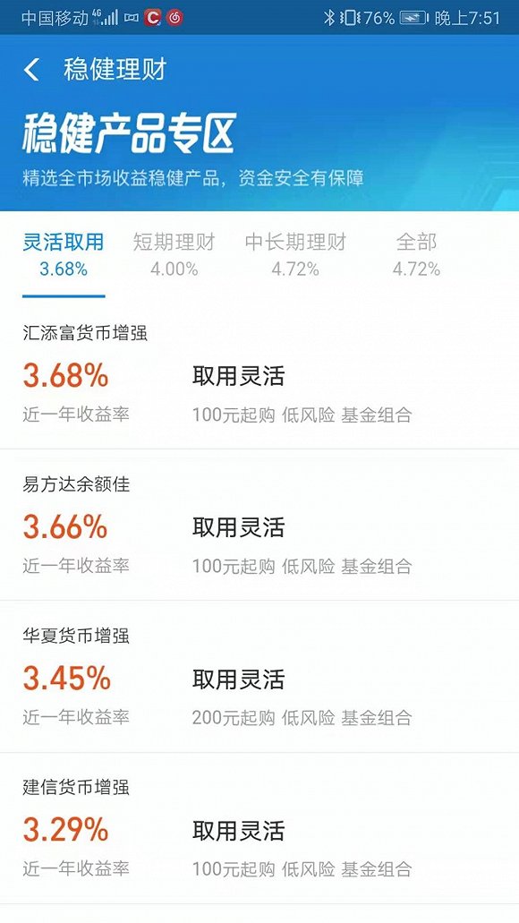 以10月14日的页面为例,目前四只产品收益率存在一定差异,目前最高的为汇添富货币增强,近一年收益率为3.68%,最低的一只产品建信货币增强收益率3.09%。不过总体来看,收益率都在3%以上,相较于不到3%的天弘基金余额宝等“宝宝类”产品来说,确实具备一定吸引力。