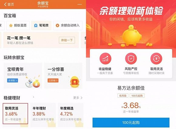 该产品出现在支付宝的“余额宝”页面下方的稳健理财,显示近一年收益率为3.68%。点击进入后显示,该产品全名为“易方达余额佳”,风险等级为“低风险”,100元起购。
