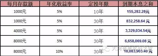当然,年化收益达到30%对于业余投资者恐怕不容易,但年化收益率5%-10%应当不难。如下图所示,如果每月在大河普惠存下8000元,年收益是10%的话,30年之后也能存下超过1800万元的财富!